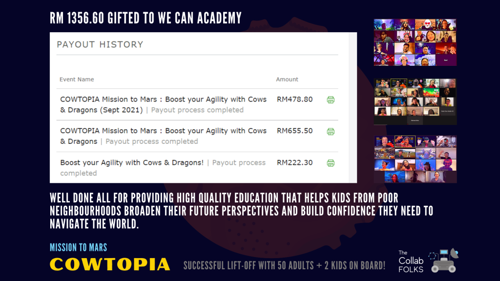 The Facilitators of COWTOPIA decided early on that proceeds from our public community events would be gifted to a cause we believed in and we are glad to share that COWTOPIA’s gifts to We Can Academy has been received by Mei Yi (Founder of We Can).