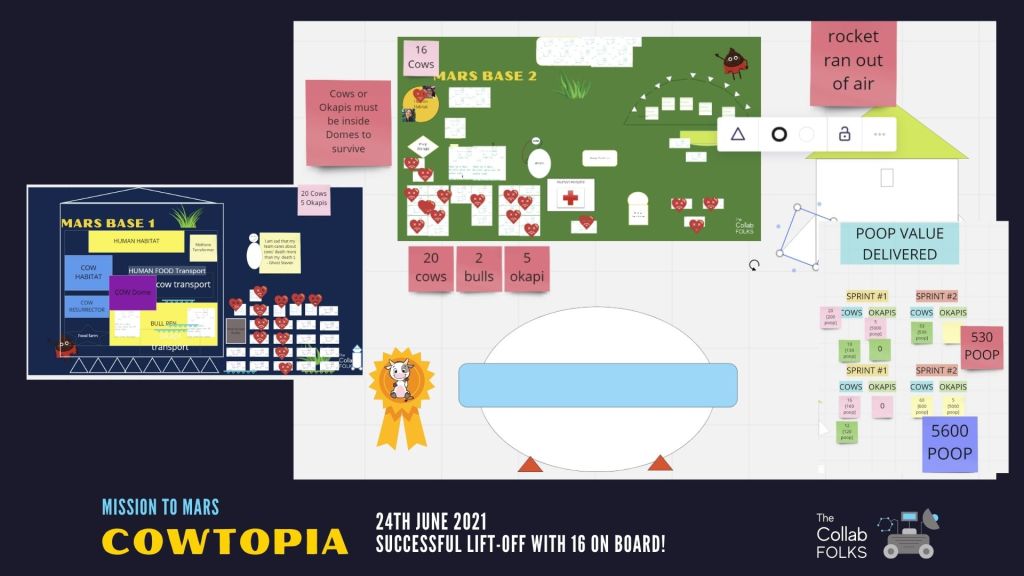 Through the serious game simulation and constraints provided, teams play by setting up working agreements, assigning roles and deliver value from Earth to Mars in iterations.